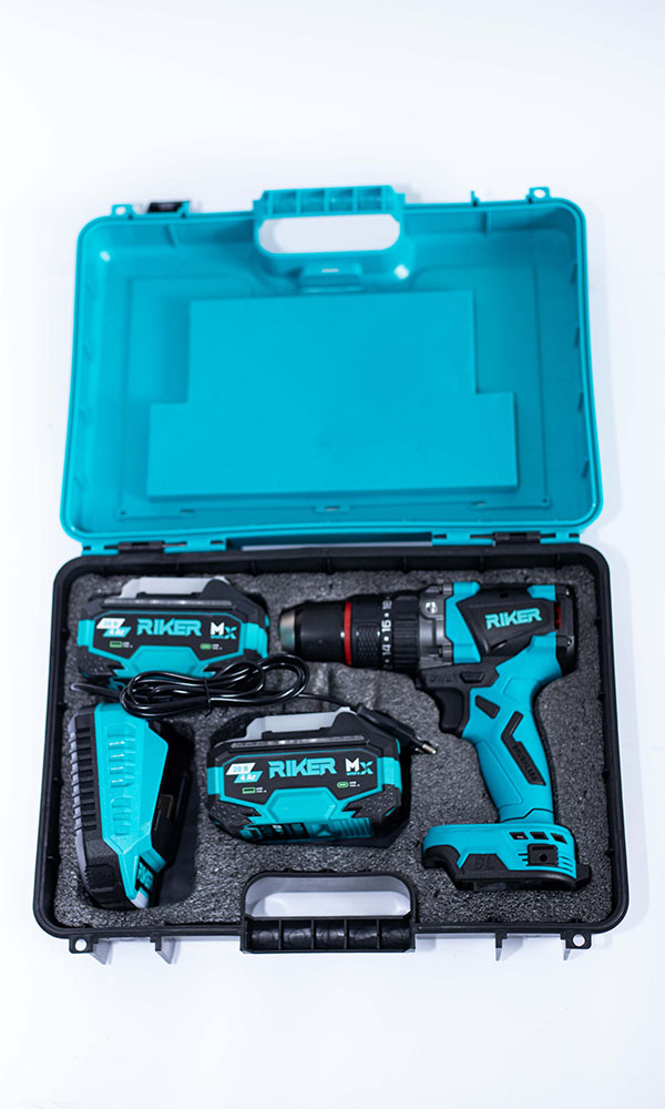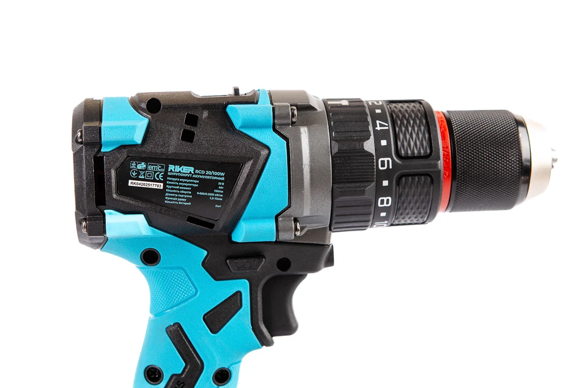 RIKER RCD 20/100W (MX series) — акумуляторний шуруповерт із безщітковим двигуном і функцією удару (Impact function), призначений для виконання робіт підвищеної складності. Завдяки крутному моменту 100 Н·м інструмент підходить для закручування кріплень великого діаметра та свердління у щільних матеріалах.